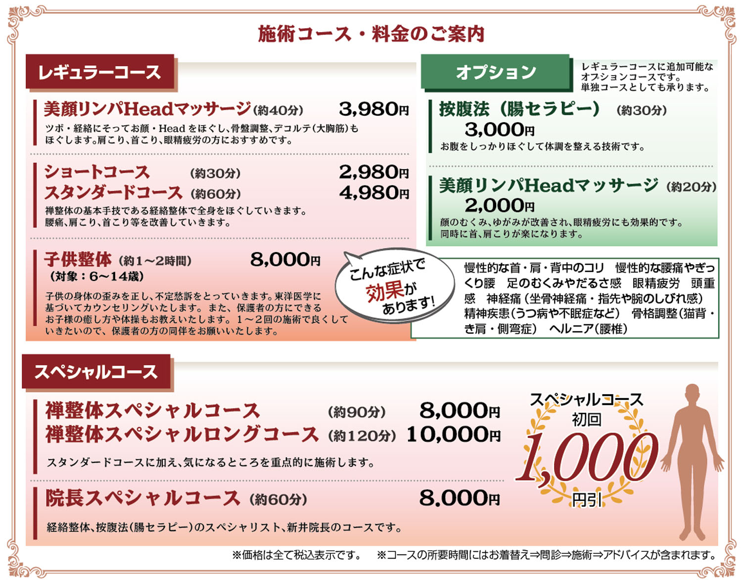価格はすべて税込み表示です。 コースの所要時間にはお着替え⇒問診⇒施術⇒アドバイスが含まれます。各コースの組み合わせも可能です。