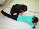 2.お客様を仰臥位にて、片足を押さえ、逆の脚の足首を固定して膝を伸ばし、お客様の顔に近づけるようにストレッチすると、膀胱経の経絡を伸展することになる。